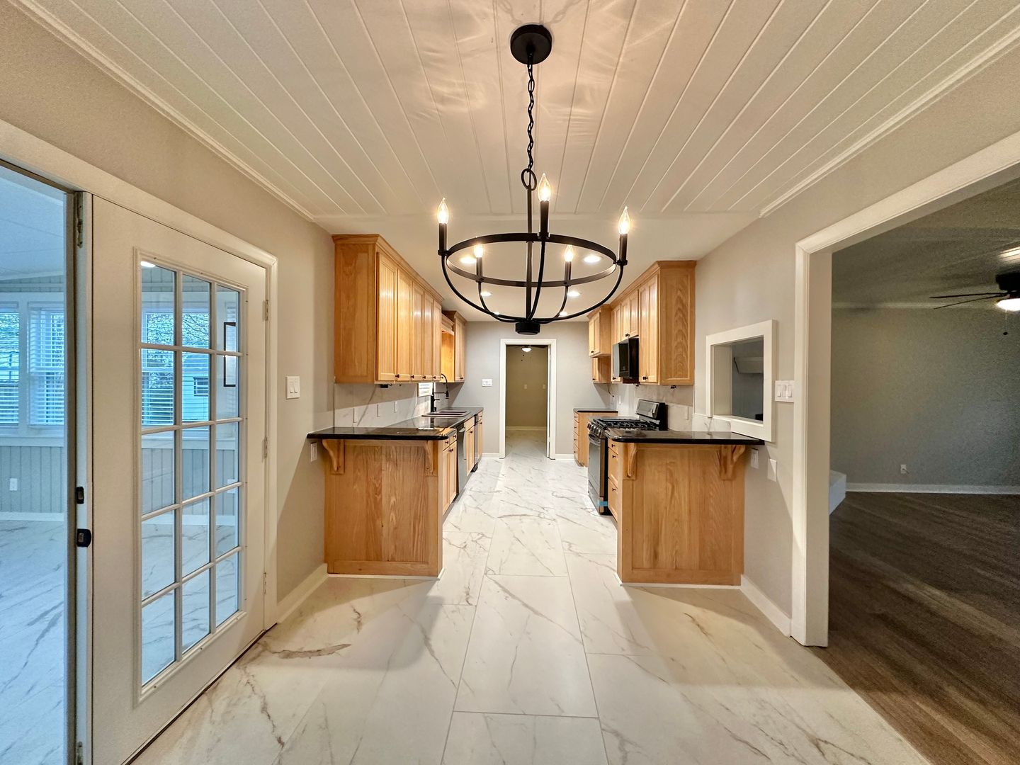 The kitchen is a chef's dream, featuring ample wooden cabinetry, elegant marble tile flooring, and sleek modern fixtures. The expansive laundry room offers extra convenience with additional ceiling fans, storage closets, and plenty of space to stay organized.
