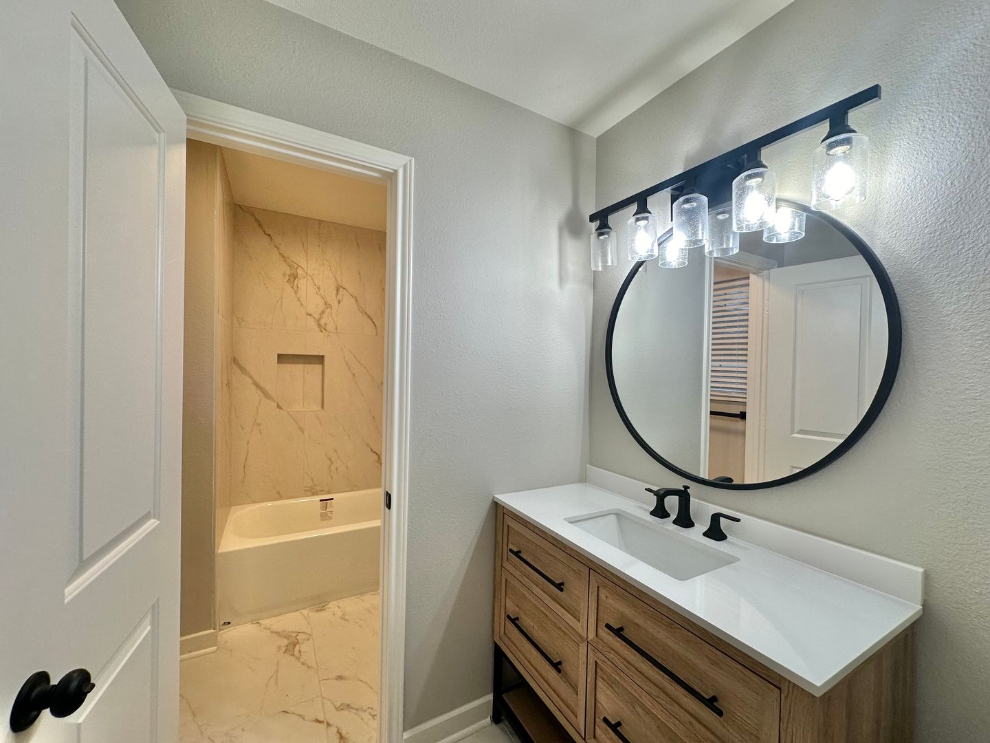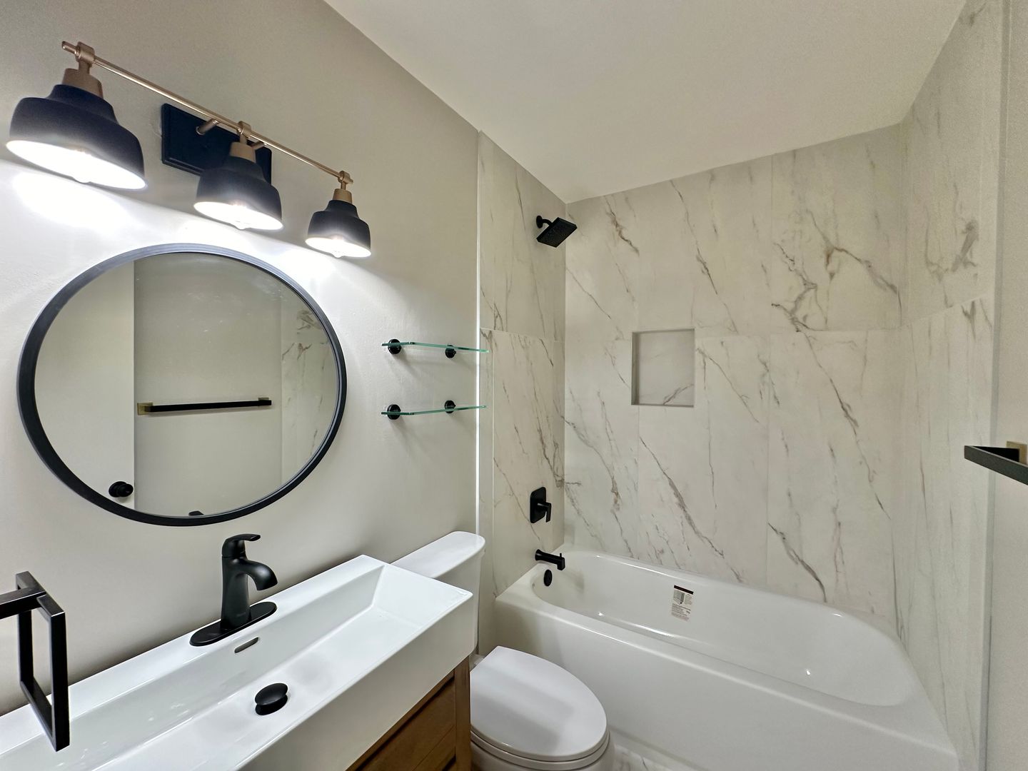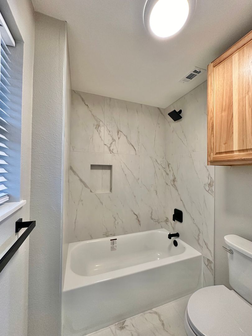 The bathrooms exude sophistication, with modern fixtures, a shower-tub combo, and stylish marble tile. Plush carpeting adds warmth to the comfortable bedrooms.
