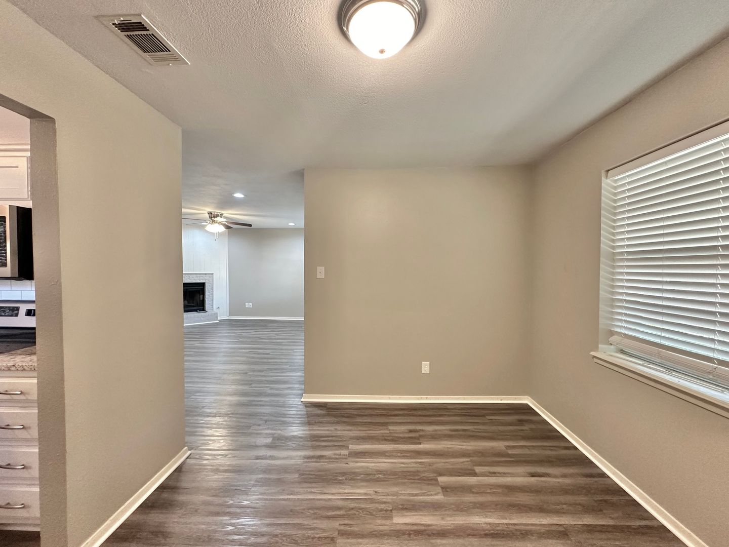 The spacious main living area welcomes you with bright can lighting, a charming brick fireplace, and beautiful wood-look floors that flow seamlessly throughout the home. To the right, discover the eat-in kitchen and a separate dining room, offering versatile spaces for both casual meals and formal gatherings. REFRIGERATOR IN PHOTOS WILL NOT COME WITH THE PROPERTY. TENANTS TO BRING THEIR OWN REFRIGERATOR.