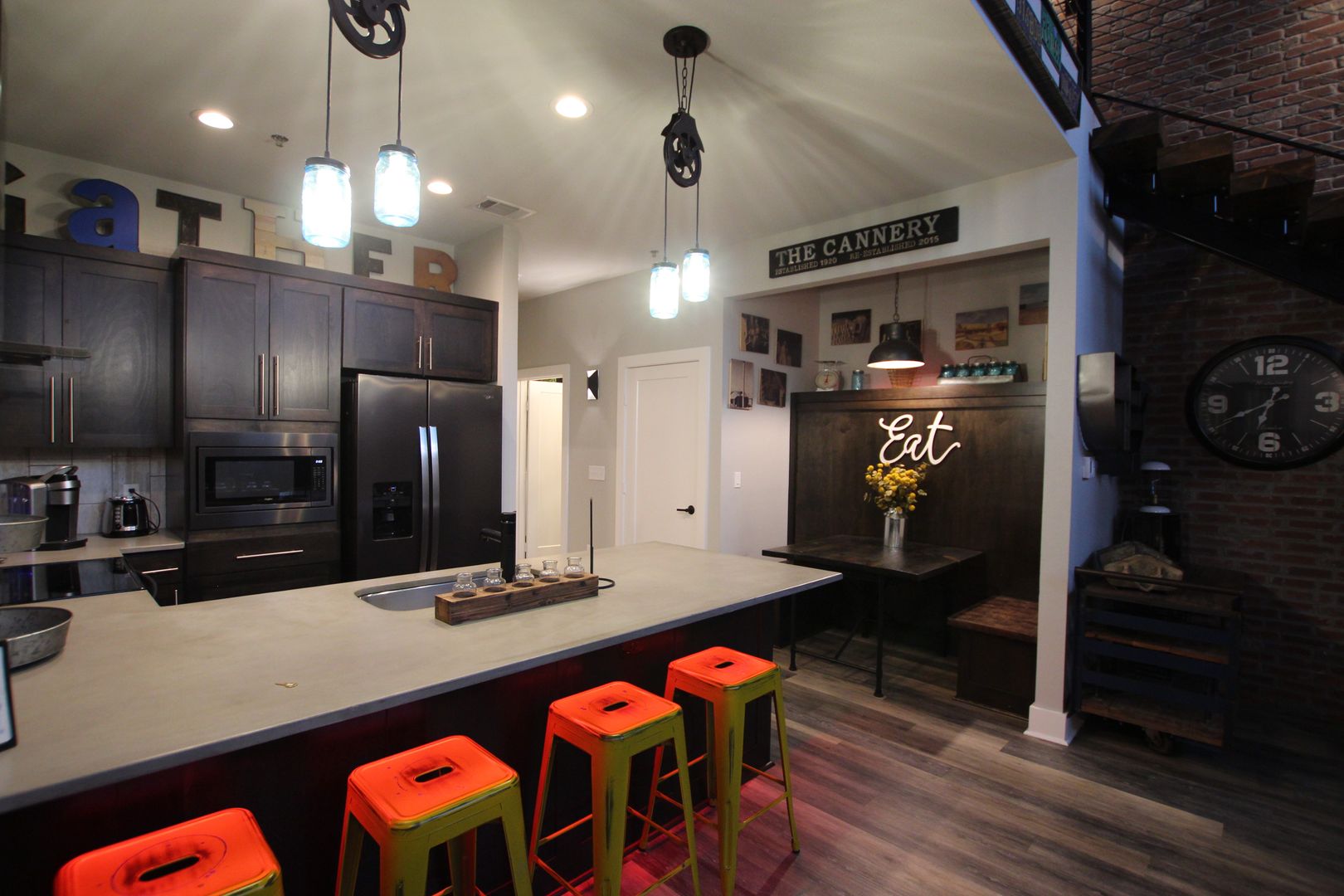 *Industrial-Chic Design – Exposed metal beams, brick accent walls & custom light fixtures.