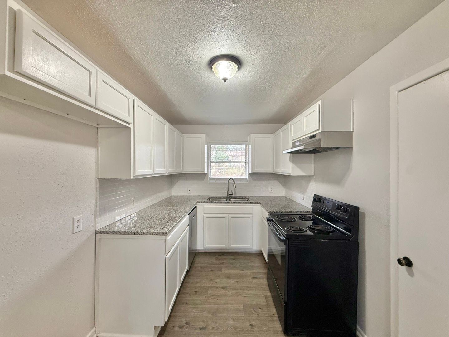 The kitchen continues the same attractive flooring and features crisp white cabinets, a convenient pantry, and a window over the sink that looks out onto the backyard—perfect for enjoying natural light while cooking or cleaning.
