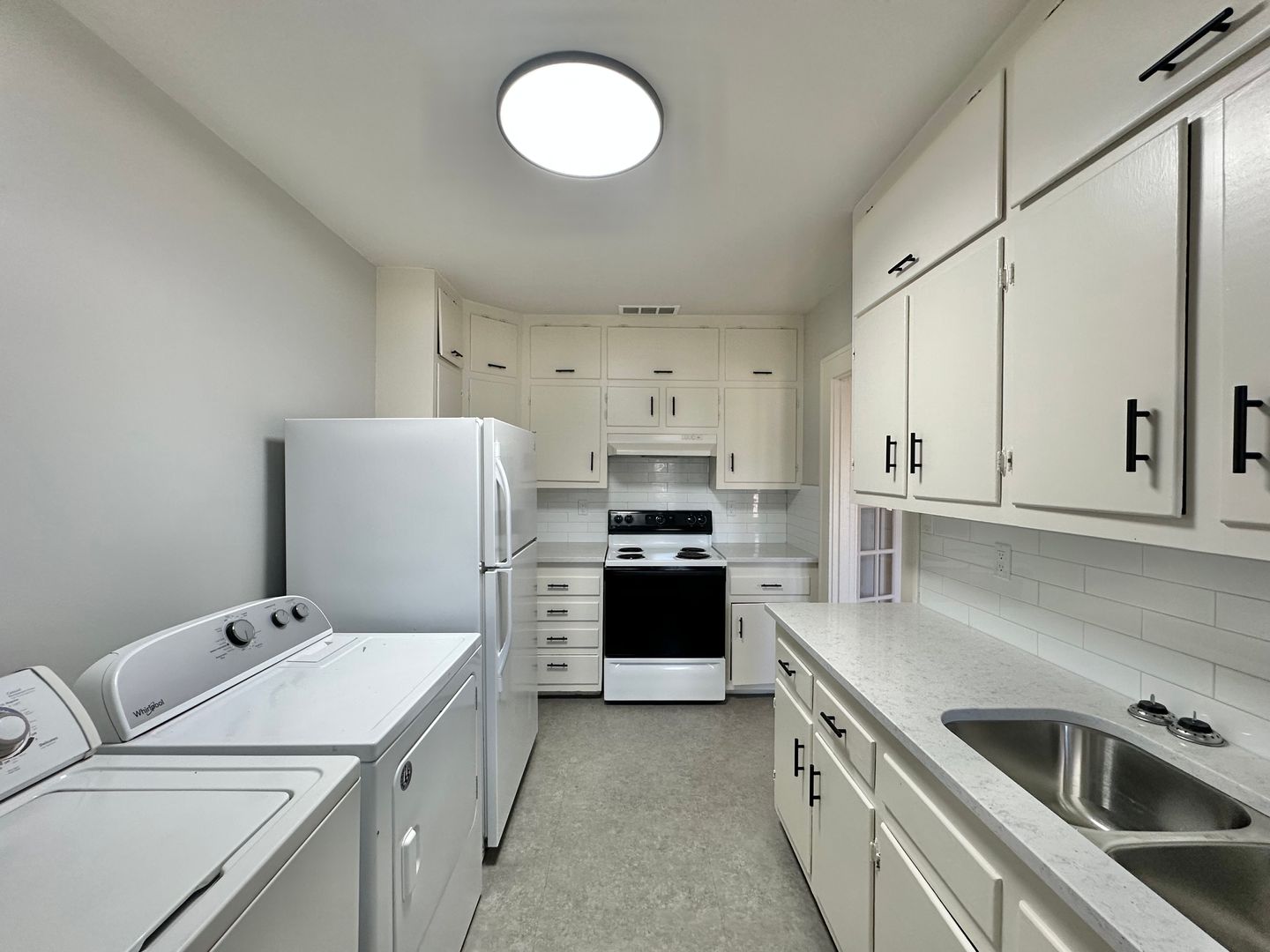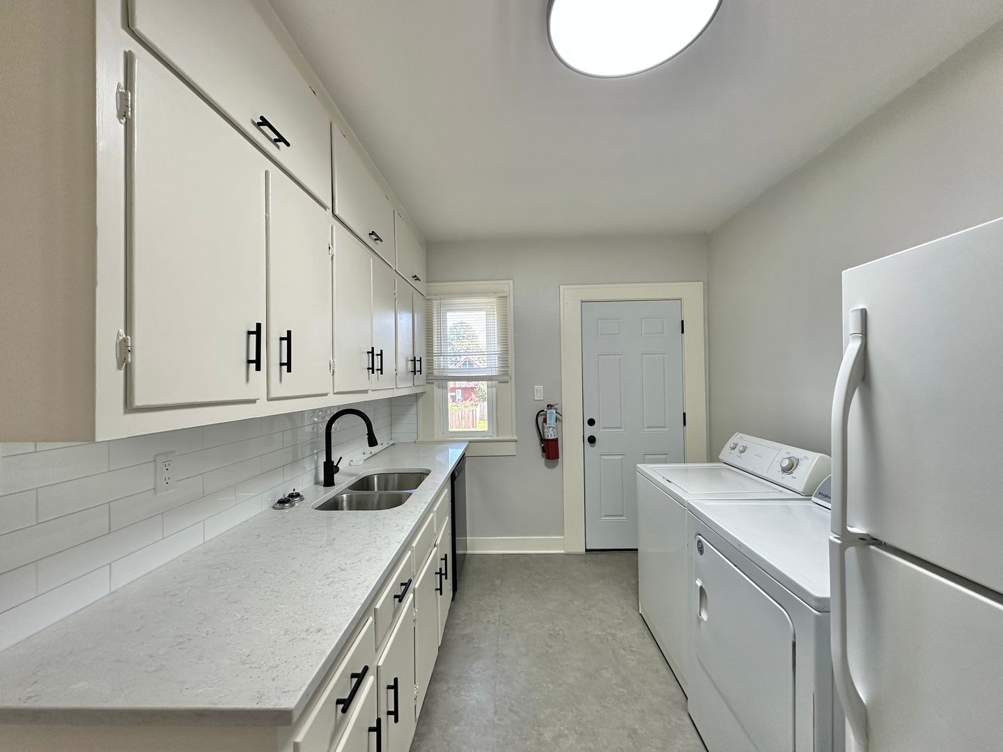 The kitchen boasts stylish updates, including freshly painted cabinets with updated hardware, granite countertops, ample storage, and a full-size washer and dryer. A second exterior access conveniently leads to the back parking lot.