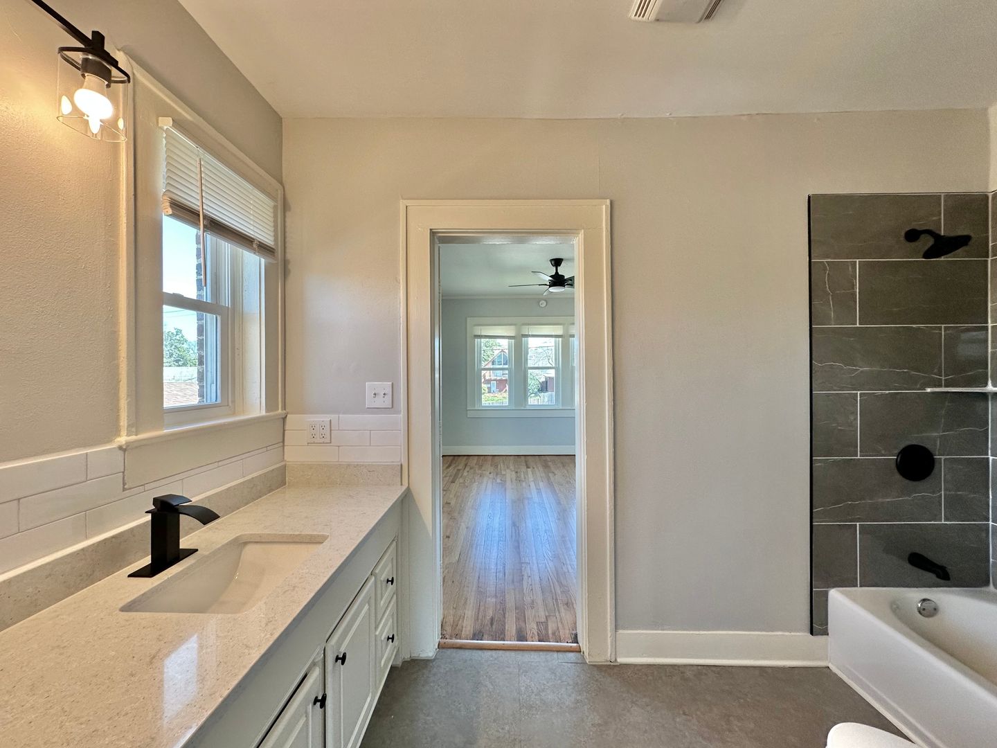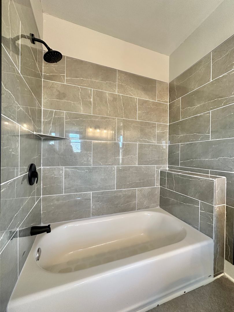 Both bedrooms offer generous space and excellent storage, while the bathroom showcases modern finishes, with stylish tile surrounding the tub, matching granite countertops, and contemporary hardware.
