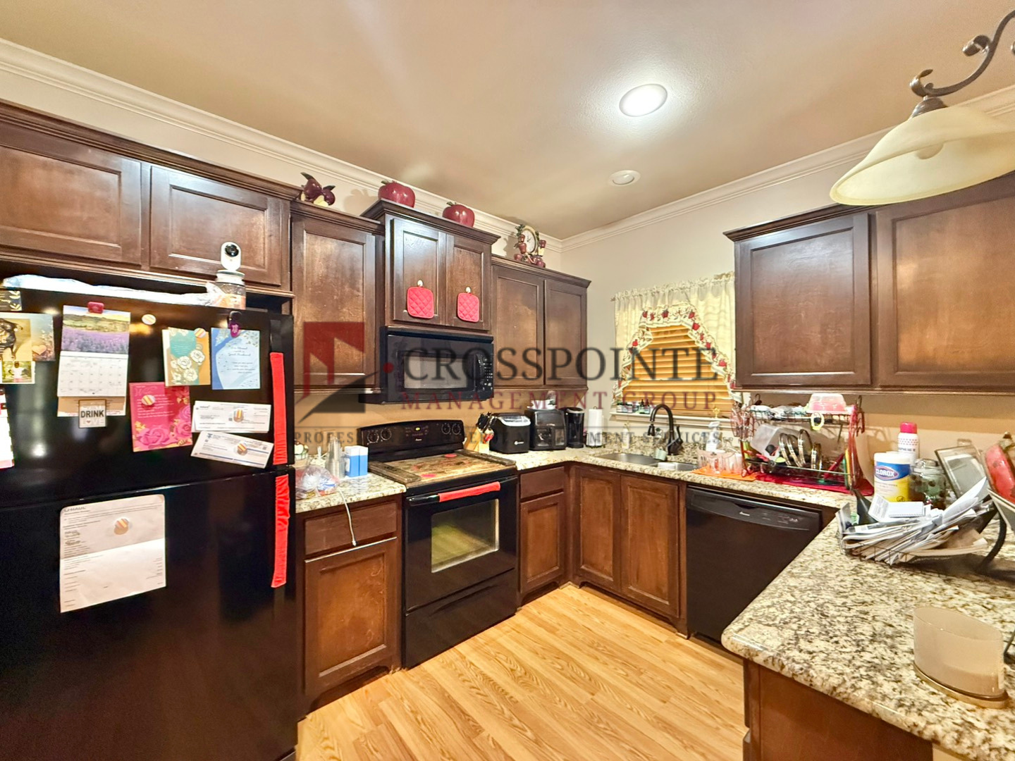 Enjoy an open-concept layout that seamlessly connects the living, dining, and kitchen areas—perfect for entertaining or relaxing at home. The kitchen is a standout, showcasing rich dark wood cabinetry, sleek granite countertops, and a full set of all-black appliances, providing both elegance and ample workspace.