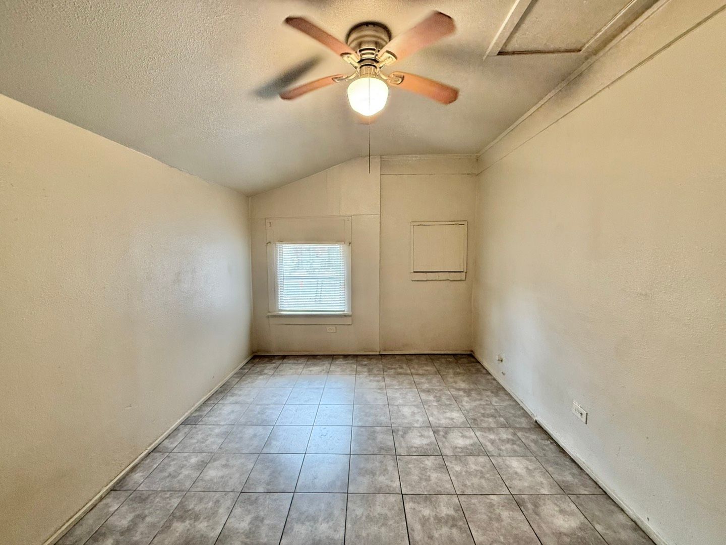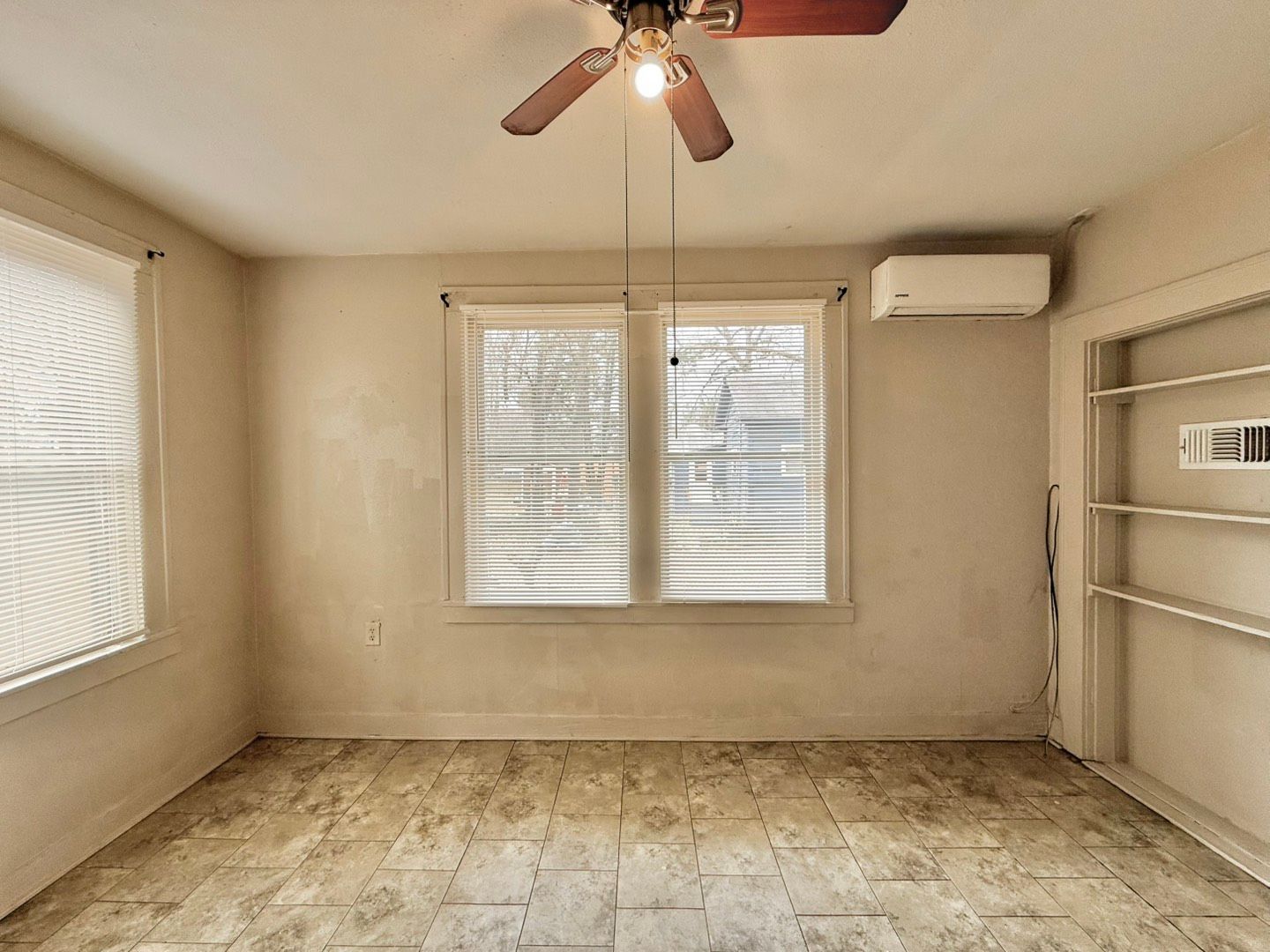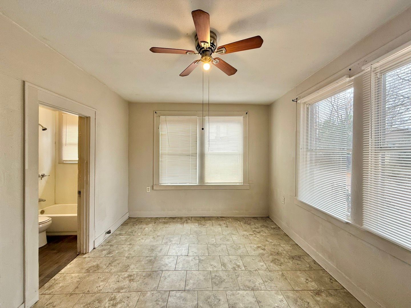The main bedroom continues the tile flooring and features a ceiling fan, open shelving, and plenty of windows that create a light and airy retreat. The bathroom, located just off the main bedroom, includes vinyl plank flooring and a shower/tub combination for added comfort and functionality.