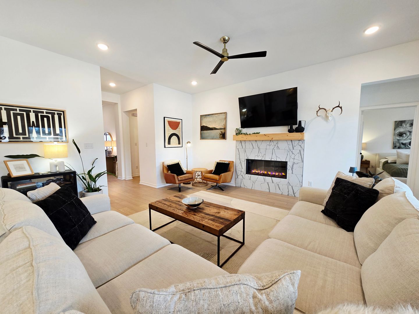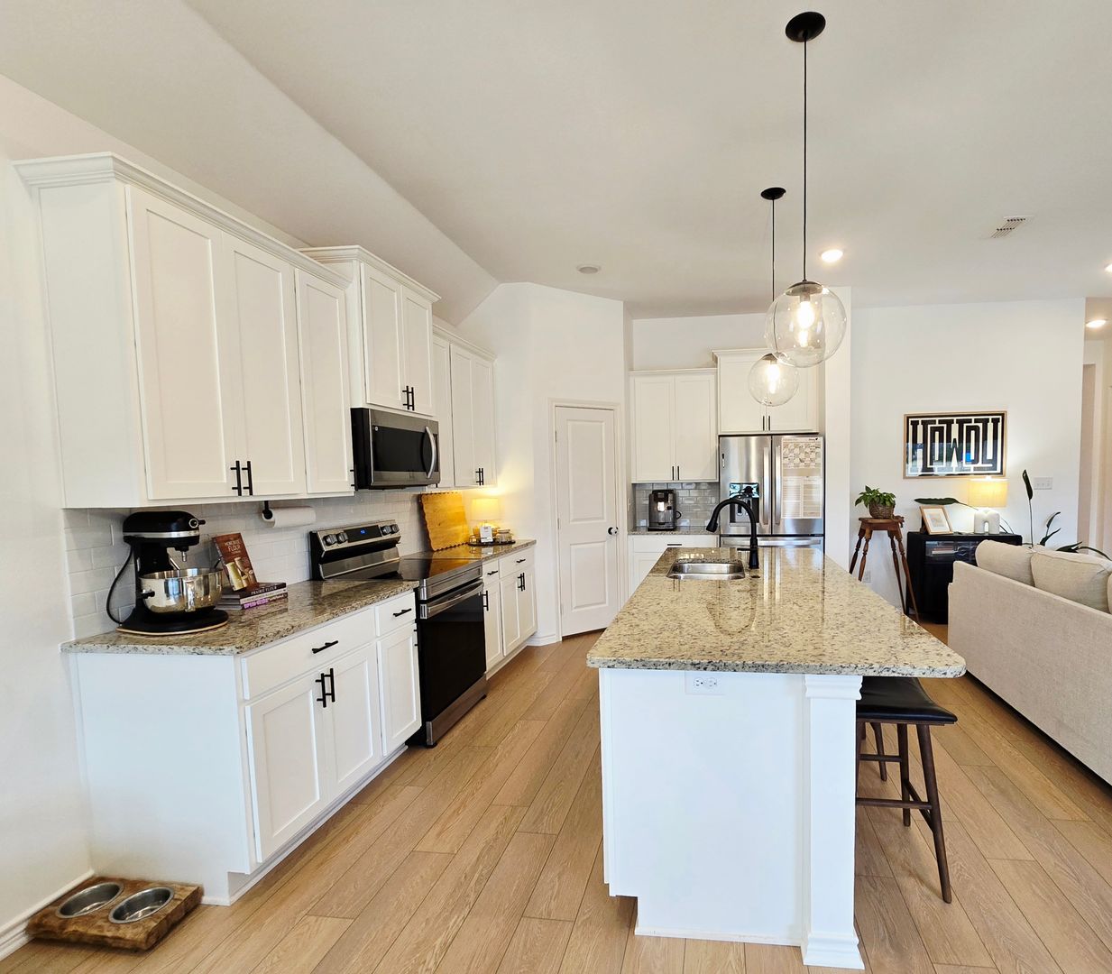 Inside, the open concept living area is filled with natural light and showcases wood look flooring and a striking marble fireplace, creating an inviting space for both relaxing and entertaining. The kitchen is designed to stand out with stainless steel appliances, granite countertops, ample cabinet and prep space, and a large island with bar top seating paired with modern fixtures.
