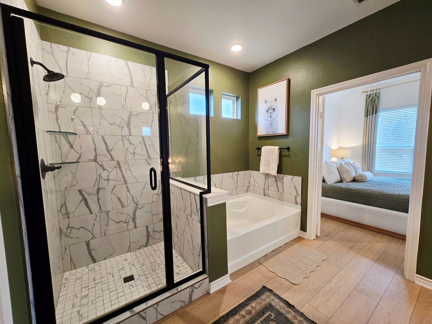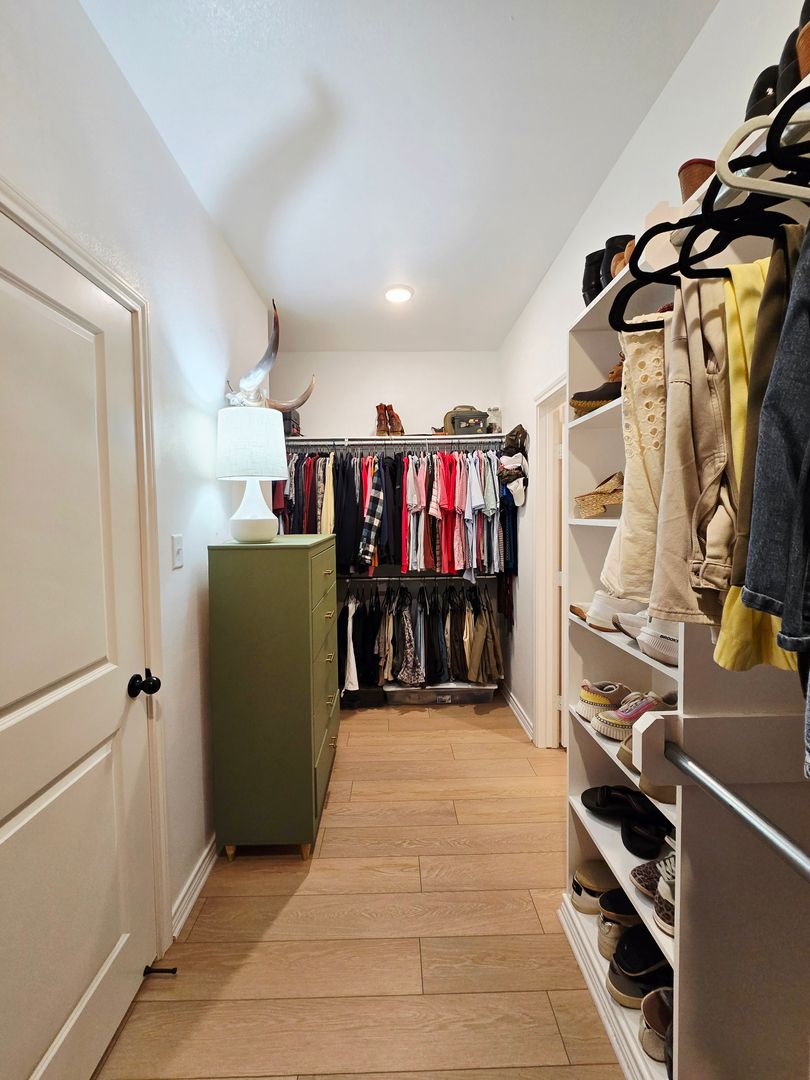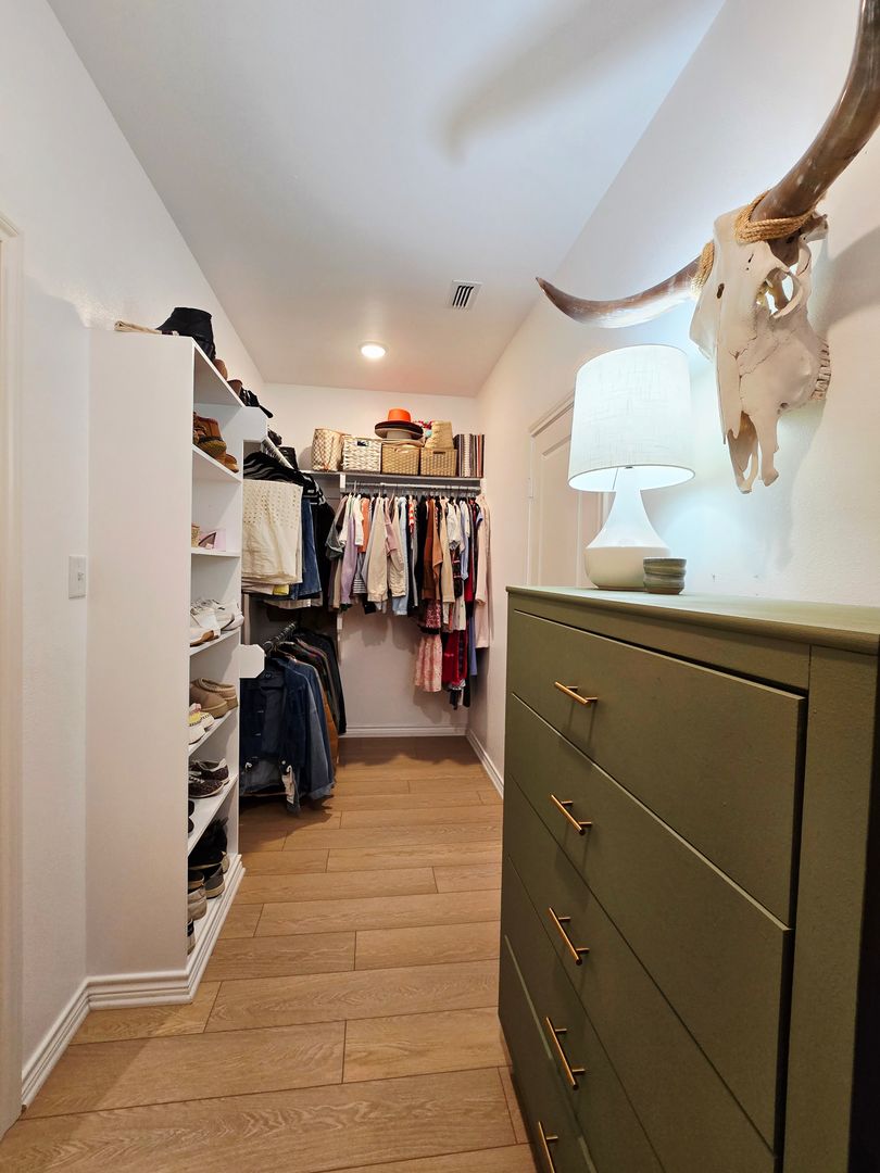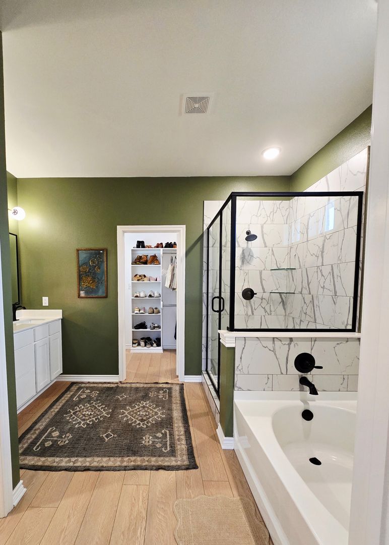 The private primary suite offers a peaceful retreat with a serene ensuite bathroom featuring a large walk in shower, a separate soaking tub with beautiful tilework, and an oversized walk in closet complete with built in shelving.