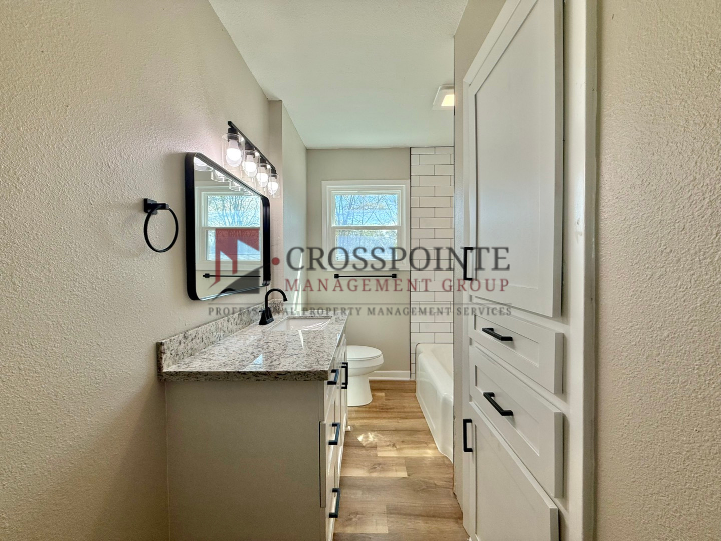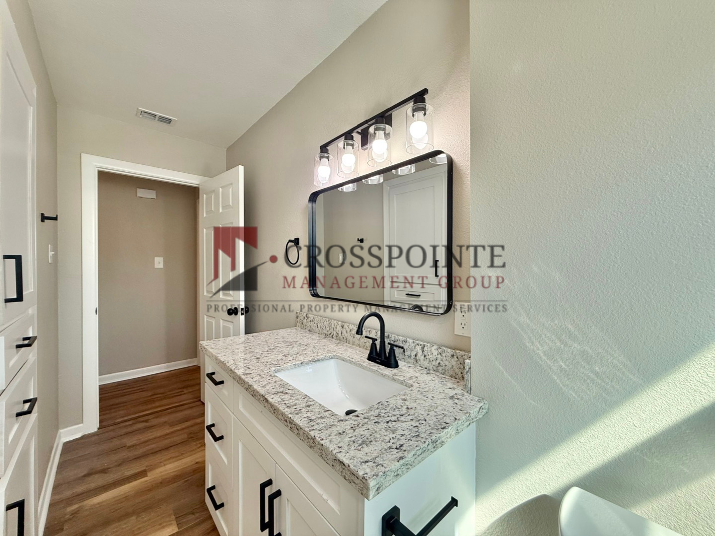 Down the hall, all three bedrooms provide a comfortable retreat, each equipped with ceiling fans and consistent finishes that carry the home’s modern aesthetic throughout. The bathroom continues the upscale feel with granite countertops, stylish black fixtures, a tub/shower combo, and built-in storage, all complemented by clean white cabinetry.